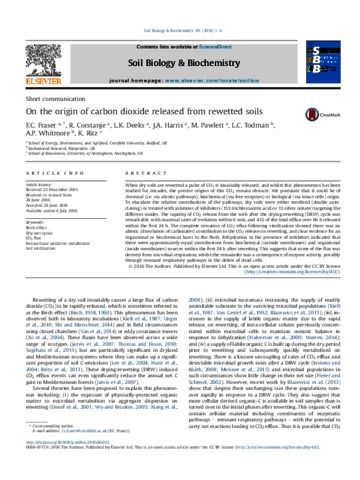 When dry soils are rewetted a pulse of CO2 is invariably released, and whilst this phenomenon has been studied for decades, the precise origins of this CO2 remain obscure. We postulate that it could be of chemical (i.e. via abiotic pathways), biochemical (via free enzymes) or biological (via intact cells) origin. To elucidate the relative contributions of the pathways, dry soils were either sterilised (double autoclaving) or treated with solutions of inhibitors (15% trichloroacetic acid or 1% silver nitrate) targeting the different modes. The rapidity of CO2 release from the soils after the drying:rewetting (DRW) cycle was remarkable, with maximal rates of evolution within 6 min, and 41% of the total efflux over 96 h released within the first 24 h. The complete cessation of CO2 eflux following sterilisation showed there was no abiotic (dissolution of carbonates) contribution to the CO2 release on rewetting, and clear evidence for an organismal or biochemical basis to the flush. Rehydration in the presence of inhibitors indicated that there were approximately equal contributions from biochemical (outside membranes) and organismal (inside membranes) sources within the first 24 h after rewetting. This suggests that some of the flux was derived from microbial respiration, whilst the remainder was a consequence of enzyme activity, possibly through remnant respiratory pathways in the debris of dead cells.