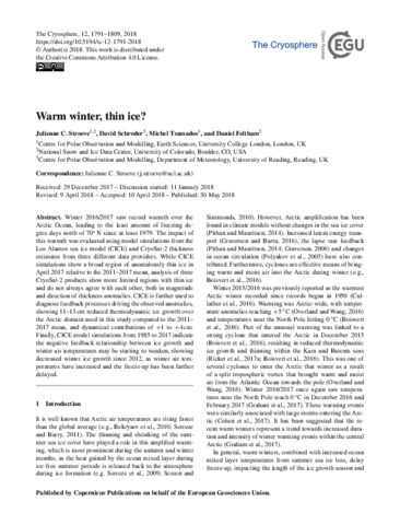 Stroeve, J. C., Schroeder, D. orcid id iconORCID: https://orcid.org/0000-0003-2351-4306, Tsamados, M. and Feltham, D. orcid id iconORCID: https://orcid.org/0000-0003-2289-014X (2018) Warm winter, thin ice? The Cryosphere, 12. pp. 1791-1809. ISSN 1994-0424 doi: 10.5194/tc-2017-287