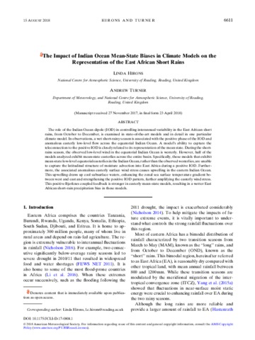 Hirons, L. orcid id iconORCID: https://orcid.org/0000-0002-1189-7576 and Turner, A. orcid id iconORCID: https://orcid.org/0000-0002-0642-6876 (2018) The impact of Indian Ocean mean-state biases in climate models on the representation of the East African short rains. Journal of Climate, 31 (16). pp. 6611-6631. ISSN 1520-0442 doi: 10.1175/JCLI-D-17-0804.1