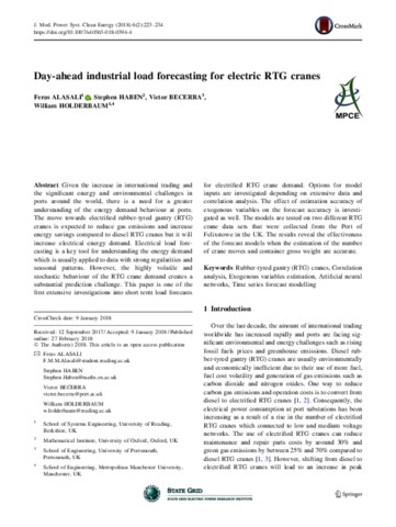 Alasali, F., Haben, S., Becerra, V. and Holderbaum, W. orcid id iconORCID: https://orcid.org/0000-0002-1677-9624 (2018) Day-ahead industrial load forecasting for electric RTG cranes. Journal of Modern Power Systems and Clean Energy, 6 (2). pp. 223-234. ISSN 2196-5625 doi: 10.1007/s40565-018-0394-4