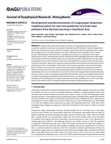 Hertwig, D. orcid id iconORCID: https://orcid.org/0000-0002-2483-2675, Burgin, L., Gan, C., Hort, M., Jones, A., Shaw, F., Witham, C. and Zhang, K. (2015) Development and demonstration of a Lagrangian dispersion modeling system for real‐time prediction of smoke haze pollution from biomass burning in Southeast Asia. Journal of Geophysical Research: Atmospheres, 120 (24). pp. 12605-12630. ISSN 2169-8996 doi: 10.1002/2015JD023422