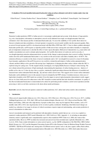 Warren, E., Charlton-Perez, C., Kotthaus, S., Lean, H., Ballard, S., Hopkin, E. and Grimmond, S. orcid id iconORCID: https://orcid.org/0000-0002-3166-9415 (2018) Evaluation of forward-modelled attenuated backscatter using an urban ceilometer network in London under clear-sky conditions. Atmospheric Environment, 191. pp. 532-547. ISSN 1352-2310 doi: 10.1016/j.atmosenv.2018.04.045