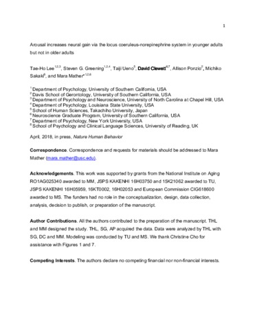 Arousal increases neural gain via the locus coeruleus-norepinephrine system in younger adults but not in older adults.