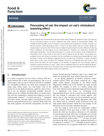 Grundy, M. M.-L., Fardet, A., Tosh, S. M., Rich, G. T. and Wilde, P. J. (2018) Processing of oat: the impact on oat's cholesterol lowering effect. Food & Function, 9 (3). pp. 1328-1343. ISSN 2042-6496 doi: 10.1039/C7FO02006F