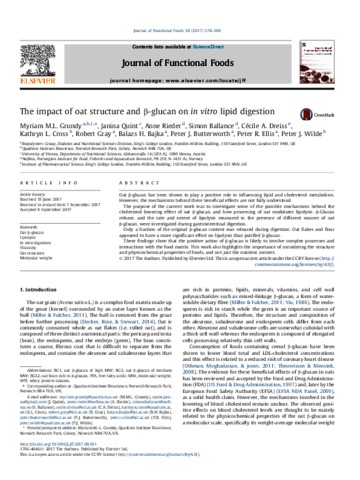 Grundy, M. M. L., Quint, J., Rieder, A., Ballance, S., Dreiss, C. A., Cross, K. L., Gray, R., Bajka, B. H., Butterworth, P. J., Ellis, P. R. and Wilde, P. J. (2017) The impact of oat structure and β-glucan on in vitro lipid digestion. Journal of Functional Foods, 38. pp. 378-388. ISSN 1756-4646 doi: 10.1016/j.jff.2017.09.011