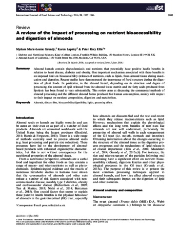 Grundy, M. M.-L., Lapsley, K. and Ellis, P. R. (2016) A review of the impact of processing on nutrient bioaccessibility and digestion of almonds. International Journal of Food Science & Technology, 51 (9). pp. 1937-1946. ISSN 09505423 doi: 10.1111/ijfs.13192