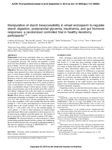 Edwards, C. H., Grundy, M. M. L., Grassby, T., Vasilopoulou, D., Frost, G. S., Butterworth, P. J., Berry, S. E. E., Sanderson, J. and Ellis, P. R. (2015) Manipulation of starch bioaccessibility in wheat endosperm to regulate starch digestion, postprandial glycemia, insulinemia, and gut hormone responses: a randomized controlled trial in healthy ileostomy participants. American Journal of Clinical Nutrition, 102 (4). pp. 791-800. ISSN 0002-9165 doi: 10.3945/ajcn.114.106203