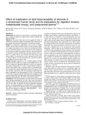Grundy, M. M. L., Grassby, T., Mandalari, G., Waldron, K. W., Butterworth, P. J., Berry, S. E. E. and Ellis, P. R. (2015) Effect of mastication on lipid bioaccessibility of almonds in a randomized human study and its implications for digestion kinetics, metabolizable energy, and postprandial lipemia. American Journal of Clinical Nutrition, 101 (1). pp. 25-33. ISSN 0002-9165 doi: 10.3945/ajcn.114.088328
