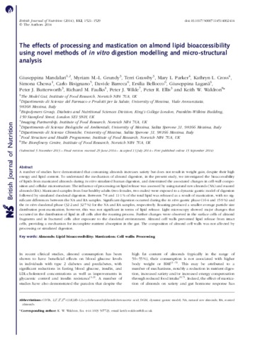 Mandalari, G., Grundy, M. M.-L., Grassby, T., Parker, M. L., Cross, K. L., Chessa, S., Bisignano, C., Barreca, D., Bellocco, E., Laganà, G., Butterworth, P. J., Faulks, R. M., Wilde, P. J., Ellis, P. R. and Waldron, K. W. (2014) The effects of processing and mastication on almond lipid bioaccessibility using novel methods of in vitro digestion modelling and micro-structural analysis. British Journal of Nutrition, 112 (09). pp. 1521-1529. ISSN 0007-1145 doi: 10.1017/S0007114514002414