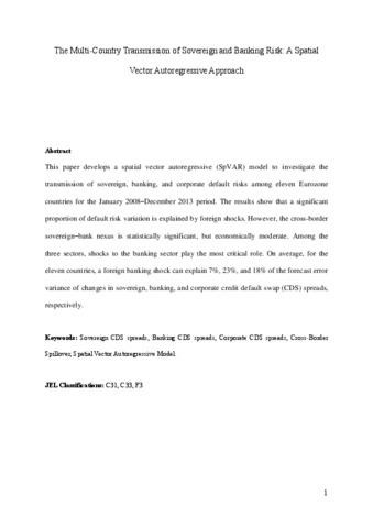 Zhu, B. (2018) The multi-country transmission of sovereign and banking risk: a spatial vector autoregressive approach. Spatial Economic Analysis, 13 (4). pp. 422-441. ISSN 1742-1780 doi: 10.1080/17421772.2018.1473890