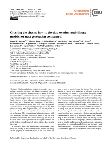 Weather and climate models are complex pieces of software which include many individual components, each of which is evolving under pressure to exploit advances in com- puting to enhance some combination of a range of possible improvements (higher spatio-temporal resolution, increased fidelity in terms of resolved processes, more quantification of uncertainty, etc.). However, after many years of a relatively stable computing environment with little choice in process- ing architecture or programming paradigm (basically X86 processors using MPI for parallelism), the existing menu of processor choices includes significant diversity, and more is on the horizon. This computational diversity, coupled with ever increasing software complexity, leads to the very real possibility that weather and climate modelling will arrive at a chasm which will separate scientific aspiration from our ability to develop and/or rapidly adapt codes to the available hardware. In this paper we review the hardware and software trends which are leading us towards this chasm, before describing current progress in addressing some of the tools which we may be able to use to bridge the chasm. This brief intro- duction to current tools and plans is followed by a discus- sion outlining the scientific requirements for quality model codes which have satisfactory performance and portability, while simultaneously supporting productive scientific evolu- tion. We assert that the existing method of incremental model improvements employing small steps which adjust to the changing hardware environment is likely to be inadequate for crossing the chasm between aspiration and hardware at a sat- isfactory pace, in part because institutions cannot have all the relevant expertise in house. Instead, we outline a method- ology based on large community efforts in engineering and standardisation, which will depend on identifying a taxon- omy of key activities – perhaps based on existing efforts to develop domain-specific languages, identify common pat- terns in weather and climate codes, and develop community approaches to commonly needed tools and libraries – and then collaboratively building up those key components. Such a collaborative approach will depend on institutions, projects, and individuals adopting new interdependencies and ways of working.
