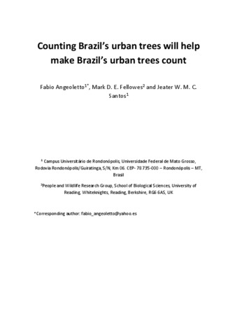 Angeoletto, F., Fellowes, M. D. E. orcid id iconORCID: https://orcid.org/0000-0001-5431-8637 and Santos, J. W. M. C. (2018) Counting Brazil’s urban trees will help make Brazil’s urban trees count. Journal of Forestry, 116 (5). pp. 489-490. ISSN 0022-1201 doi: 10.1093/jofore/fvy026