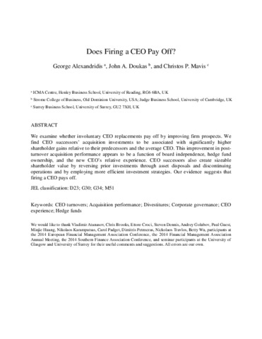 Alexandridis, G., Doukas, J. A. and Mavis, C. P. (2019) Does firing a CEO pay off? Financial Management, 48 (1). pp. 3-43. ISSN 1755-053X doi: 10.1111/fima.12228