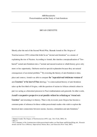 Cheyette, B. (2018) Postcolonialism and the study of anti-semitism. The American Historical Review, 123 (4). pp. 1234-1245. ISSN 0002-8762 doi: 10.1093/ahr/rhy028