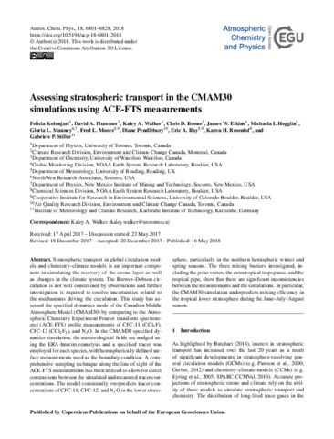 Kolonjari, F., Plummer, D. A., Walker, K. A., Boone, C. D., Elkins, J. W., Hegglin, M. I. orcid id iconORCID: https://orcid.org/0000-0003-2820-9044, Manney, G. L., Moore, F. L., Pendlebury, D., Ray, E. A., Rosenlof, K.H. and Stiller, G.P. (2018) Assessing stratospheric transport in the CMAM30 simulations using ACE-FTS measurements. Atmospheric Chemistry and Physics, 18 (9). pp. 6801-6828. ISSN 1680-7316 doi: 10.5194/acp-18-6801-2018