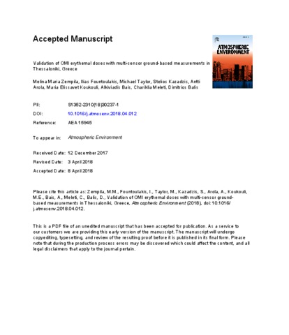 Zempila, M. M., Fountoulakis, I., Taylor, M., Kazadzis, S., Arola, A., Koukouli, M. E., Bais, A., Meleti, C. and Balis, D. (2018) Validation of OMI erythemal doses with multi-sensor ground-based measurements in Thessaloniki, Greece. Atmospheric Environment, 183. pp. 106-121. ISSN 13522310 doi: 10.1016/j.atmosenv.2018.04.012
