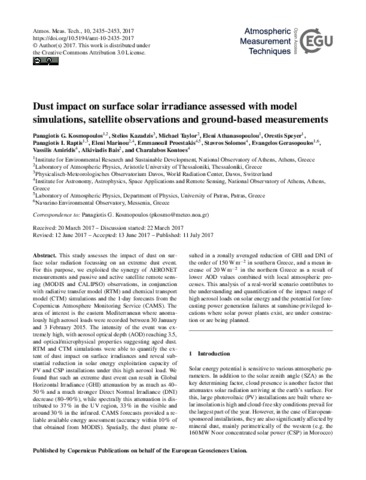 Kosmopoulos, P. G., Kazadzis, S., Taylor, M., Athanasopoulou, E., Speyer, O., Raptis, P. I., Marinou, E., Proestakis, E., Solomos, S., Gerasopoulos, E., Amiridis, V., Bais, A. and Kontoes, C. (2017) Dust impact on surface solar irradiance assessed with model simulations, satellite observations and ground-based measurements. Atmospheric Measurement Techniques, 10 (7). pp. 2435-2453. ISSN 1867-8548 doi: 10.5194/amt-10-2435-2017