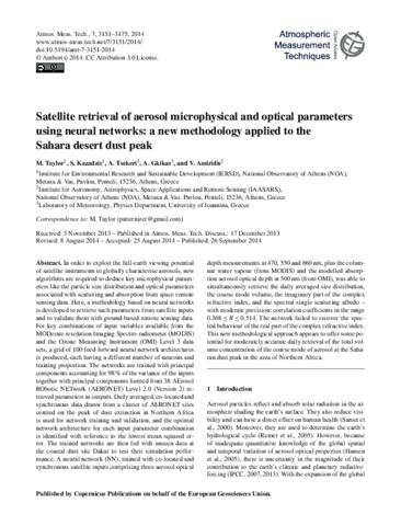 Taylor, M., Kazadzis, S., Tsekeri, A., Gkikas, A. and Amiridis, V. (2014) Satellite retrieval of aerosol microphysical and optical parameters using neural networks: a new methodology applied to the Sahara desert dust peak. Atmospheric Measurement Techniques, 7 (9). pp. 3151-3175. ISSN 1867-8548 doi: 10.5194/amt-7-3151-2014