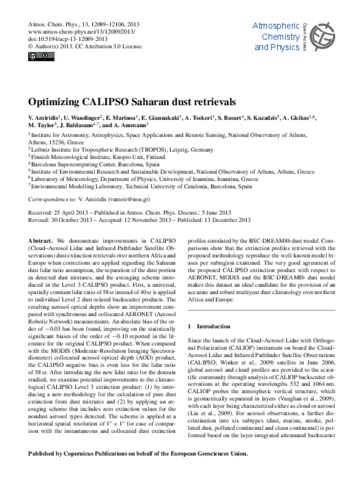 Amiridis, V., Wandinger, U., Marinou, E., Giannakaki, E., Tsekeri, A., Basart, S., Kazadzis, S., Gkikas, A., Taylor, M., Baldasano, J. and Ansmann, A. (2013) Optimizing CALIPSO Saharan dust retrievals. Atmospheric Chemistry and Physics, 13 (23). pp. 12089-12106. ISSN 1680-7324 doi: 10.5194/acp-13-12089-2013