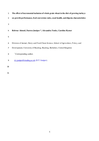 The effect of incremental inclusion of whole grain wheat in the diet of growing turkeys on growth performance, feed conversion ratio, cecal health, and digesta characteristics.