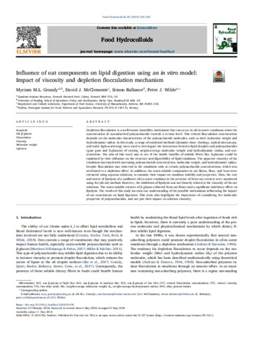 Grundy, M. M. L., McClements, D. J., Ballance, S. and Wilde, P. J. (2018) Influence of oat components on lipid digestion using an in vitro model: impact of viscosity and depletion flocculation mechanism. Food Hydrocolloids, 83. pp. 253-264. ISSN 0268-005X doi: 10.1016/j.foodhyd.2018.05.018