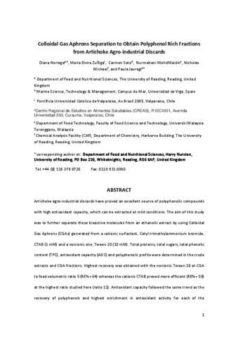 Noriega, D., Zuñiga, M. E., Soto, C., MohdMaidin, N., Michael, N. and Jauregi, P. (2018) Colloidal gas aphrons separation to obtain polyphenol rich fractions from artichoke agro-industrial discards. Food and Bioproducts Processing, 110. pp. 50-59. ISSN 0960-3085 doi: 10.1016/j.fbp.2018.04.007