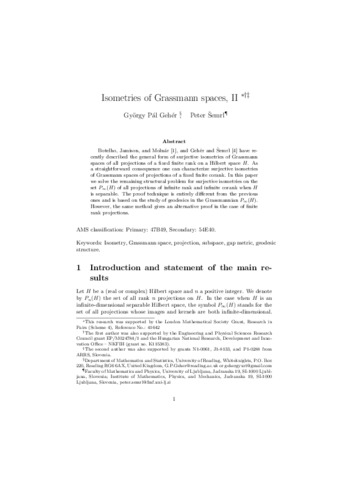 Geher, G. P. and Semrl, P. (2018) Isometries of Grassmann spaces, II. Advances in Mathematics, 332 (9). pp. 287-310. ISSN 1090-2082 doi: 10.1016/j.aim.2018.05.012