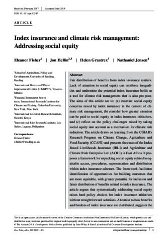 Motivation Fair distribution of benefits from index insurance matters. Lack of attention to social equity can reinforce inequalities and undermine the potential index insurance holds as a tool for climate risk management that is also pro-poor. Purpose The aims are to: (i) examine social equity concerns raised by index insurance in the context of climate risk management; (ii) consider how greater attention can be given to social equity in index insurance initiatives; and (iii) reflect on the policy challenges raised by seeking to take social equity into account as a mechanism for climate risk reduction. Approach and methods The article draws on learning from the CGIAR’s Research Program on Climate Change, Agriculture and Food Security (CCAFS) and presents the cases of the Index Based Livelihoods Insurance (IBLI) and Agriculture and Climate Risk Enterprise Ltd. (ACRE) in East Africa. It proposes a framework for unpacking social equity related to equitable access, procedures, representation and distribution within index insurance schemes Findings Systematically addressing social equity raises hard policy choices for index insurance initiatives without straightforward solutions. Attention to how benefits and burdens of index insurance are distributed raises the unpalateable truth for development policy that the poorest members of rural society can be excluded. Nevertheless, a focus on social equity may open up opportunities to ensure index insurance is linked to more socially just climate risk management. At the very least, it may prevent index insurance from generating greater inequality. Taking social equity into account thus, shifts the focus from agricultural systems in transition per se to systems with potential to incorporate societal transformation through distributive justice. Policy implications A framework is presented for unpacking different dimensions of social equity in index insurance schemes. It is intended to facilitate identification of opportunities for building outcomes that are more equitable, with greater potential for inclusion and fairer distribution.