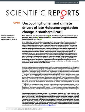 Robinson, M., De Souza, J. G., Maezumi, S. Y., Cardenas, M., Pessenda, L., Prufer, K., Corteletti, R., Scunderlick, D., Mayle, F. E. orcid id iconORCID: https://orcid.org/0000-0001-9208-0519, De Blasis, P. and Iriarte, J. (2018) Uncoupling human and climate drivers of late Holocene vegetation change in southern Brazil. Scientific Reports, 8. 7800. ISSN 2045-2322 doi: 10.1038/s41598-018-24429-5