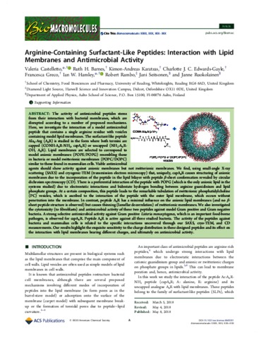 Castelletto, V., Barnes, R. H., Karatzas, K.-A., Edwards-Gayle, C. J. C., Greco, F., Hamley, I. W. orcid id iconORCID: https://orcid.org/0000-0002-4549-0926, Rambo, R., Seitsonen, J. and Ruokolainen, J. (2018) Arginine-containing surfactant-like peptides: interaction with lipid membranes and antimicrobial activity. Biomacromolecules, 19 (7). pp. 2782-2794. ISSN 1525-7797 doi: 10.1021/acs.biomac.8b00391