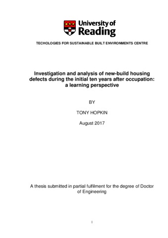 Hopkin, T. J. (2018) Investigation and analysis of new-build housing defects during the initial ten years after occupation: a learning perspective. EngD thesis, University of Reading.