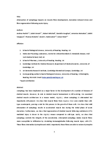 Paolini, A., Omairi, S., Mitchell, R., Vaughan, D., Matsakas, A., Vaiyapuri, S. orcid id iconORCID: https://orcid.org/0000-0002-6006-6517, Ricketts, T., Rubinsztein, D. C. and Patel, K. (2018) Attenuation of autophagy impacts on muscle fibre development, starvation induced stress and fibre regeneration following acute injury. Scientific Reports, 8. 9062. ISSN 2045-2322 doi: 10.1038/s41598-018-27429-7