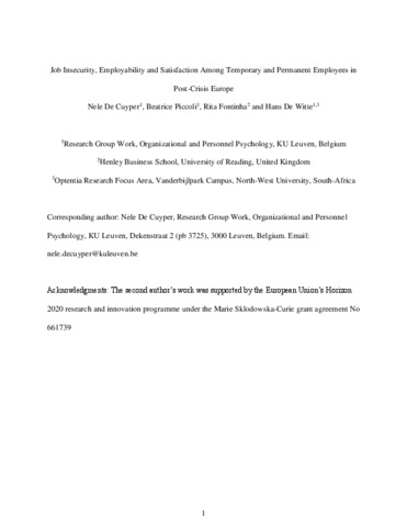 Earlier studies established that perceived job insecurity is more strongly related to the experiences of permanent employees, and conversely that perceived employability is more strongly related to the experiences of temporary employees. We challenge these results against the background of the 2008/2009 crisis using samples from the 2010 European Social Survey with employees from Continental and Mediterranean Europe. First, we argue that job insecurity has become a structural phenomenon that associates with temporary and permanent employees’ satisfaction in the same fashion, which found overall support. Second, we argue that employability may have become important for all employees, regardless of contract type, which was largely supported. A cause for concern is that the relationship between perceived job insecurity and satisfaction was comparatively stronger than the relationship between perceived employability and satisfaction. This may suggest that employees have not yet fully embraced ideas about employability as the new form of security.