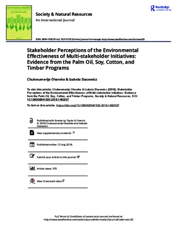 Okereke, C. and Stacewicz, I. (2018) Stakeholder perceptions of the environmental effectiveness of multi-stakeholder initiatives: evidence from the palm oil, soy, cotton, and timber programs. Society and Natural Resources, 31 (11). pp. 1302-1318. ISSN 1521-0723 doi: 10.1080/08941920.2018.1482037