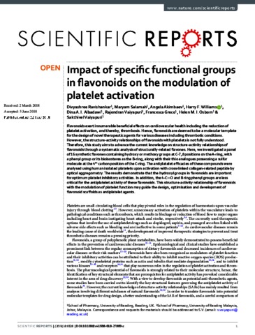 Ravishankar, D., Salamah, M., Akimbaev, A., Williams, H. F., Albadawi, D. A. I., Vaiyapuri, R., Greco, F., Osborn, H. M. I. orcid id iconORCID: https://orcid.org/0000-0002-0683-0457 and Vaiyapuri, S. orcid id iconORCID: https://orcid.org/0000-0002-6006-6517 (2018) Impact of specific functional groups in flavonoids on the modulation of platelet activation. Scientific Reports, 8. 9528. ISSN 2045-2322 doi: 10.1038/s41598-018-27809-z