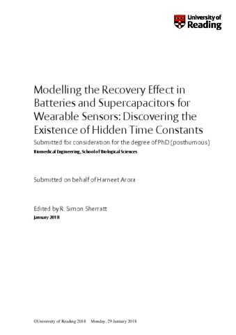 Arora, H. (2018) Modelling the recovery effect in batteries and supercapacitors for wearable sensors: discovering the existence of hidden time constants. PhD thesis, University of Reading. doi: 10.48683/1926.00077542
