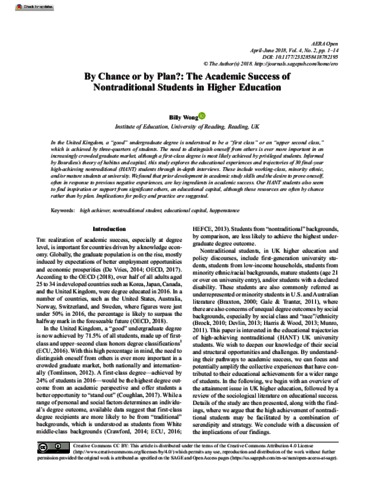 Wong, B. orcid id iconORCID: https://orcid.org/0000-0002-7310-6418 (2018) By chance or by plan?: The academic success of nontraditional students in higher education. AERA Open, 4 (2). 233285841878219. ISSN 2332-8584 doi: 10.1177/2332858418782195