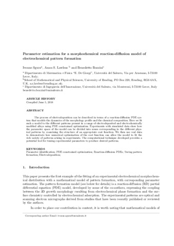 Sgura, I., Lawless, A. S. orcid id iconORCID: https://orcid.org/0000-0002-3016-6568 and Bozzini, B. (2019) Parameter estimation for a morphochemical reaction-diffusion model of electrochemical pattern formation. Inverse Problems in Science and Engineering, 27 (5). pp. 618-647. ISSN 1741-5985 doi: 10.1080/17415977.2018.1490278