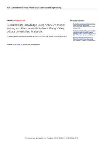 Kuppusamy, S., Khamidi, M. F., Lee, X. S. and Mari, T. S. (2018) Sustainability knowledge using “AKASA” model among architecture students from Klang Valley private universities, Malaysia. In: International Conference on Architecture and Civil Engineering, 8 May 2017, Petaling Jaya, Selangor Malaysia.