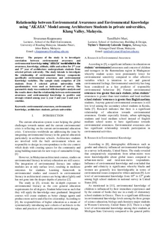Relationship between environmental awareness and environmental knowledge using “AKASA” model among architecture students in private universities, Klang Valley, Malaysia