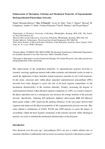 Hermida-Merino, D., O'Driscoll, B., Hart, L. R., Harris, P. J., Colquhoun, H. M., Slark, A. T., Prisacariu, C., Hamley, I. W. orcid id iconORCID: https://orcid.org/0000-0002-4549-0926 and Hayes, W. orcid id iconORCID: https://orcid.org/0000-0003-0047-2991 (2018) Enhancement of microphase ordering and mechanical properties of supramolecular hydrogen-bonded polyurethane networks. Polymer Chemistry, 9 (24). pp. 3406-3414. ISSN 1759-9954 doi: 10.1039/C8PY00604K