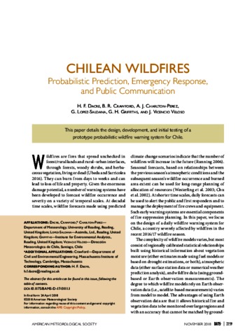 Dacre, H. F. orcid id iconORCID: https://orcid.org/0000-0003-4328-9126, Crawford, B. R., Charlton-Perez, A. J. orcid id iconORCID: https://orcid.org/0000-0001-8179-6220, Lopez-Saldana, G., Griffiths, G. H. orcid id iconORCID: https://orcid.org/0009-0002-6340-3686 and Vicencio Veloso, J. (2018) Chilean wildfires: probabilistic prediction, emergency response and public communication. Bulletin of the American Meteorological Society. pp. 2259-2274. ISSN 1520-0477 doi: 10.1175/BAMS-D-17-0111.1