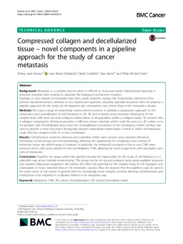 Keeton, S. J., Delalande, J. M., Cranfield, M., Burns, A. and Dash, P. R. (2018) Compressed collagen and decellularized tissue: novel components in a pipeline approach for the study of cancer metastasis. BMC Cancer, 18 (622). ISSN 1471-2407 doi: 10.1186/s12885-018-4533-0