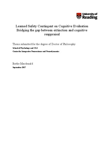 MacDonald, B. E. (2018) Learned safety contingent on cognitive evaluation bridging the gap between extinction and cognitive reappraisal. PhD thesis, University of Reading.