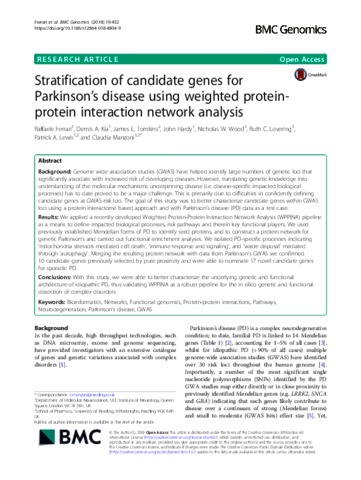 Ferrari, R., Kia, D. A., Tomkins, J. E., Hardy, J., Wood, N. W., Lovering, R. C., Lewis, P. A. and Manzoni, C. (2018) Stratification of candidate genes for Parkinson’s disease using weighted protein interaction network analysis. BMC Genomics, 19. 452. ISSN 1471-2164 doi: 10.1186/s12864-018-4804-9