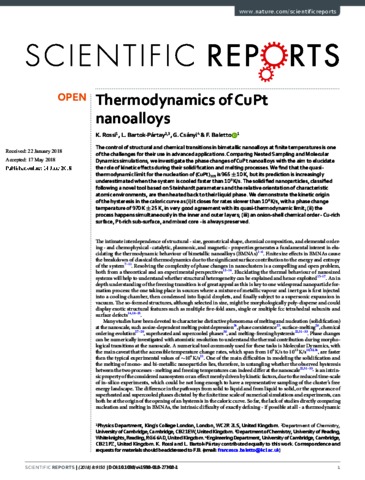 Rossi, K., Partay, L., Csanyi, G. and Baletto, F. (2018) Thermodynamics of CuPt nanoalloys. Scientific Reports, 8. 9150. ISSN 2045-2322 doi: 10.1038/s41598-018-27308-1
