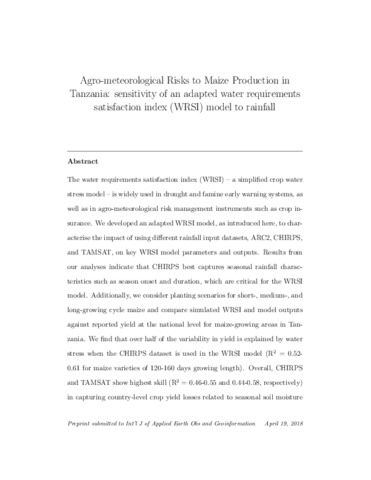 Agro-meteorological risks to maize production in Tanzania: sensitivity of an adapted water requirements satisfaction index (WRSI) model to rainfall.
