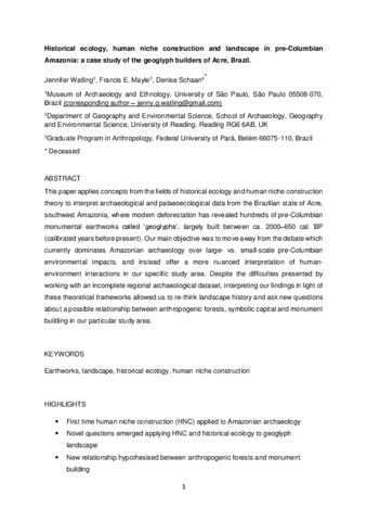 Watling, J., Mayle, F. E. orcid id iconORCID: https://orcid.org/0000-0001-9208-0519 and Schaan, D. (2018) Historical ecology, human niche construction and landscape in pre-Columbian Amazonia: a case study of the geoglyph builders of Acre, Brazil. Journal of Anthropological Archaeology, 50. pp. 128-139. ISSN 0278-4165 doi: 10.1016/j.jaa.2018.05.001