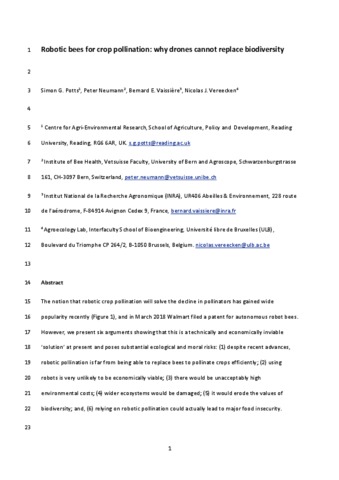 Potts, S. G. orcid id iconORCID: https://orcid.org/0000-0002-2045-980X, Neumann, P., Vaissière, B. and Vereecken, N. J. (2018) Robotic bees for crop pollination: why drones cannot replace biodiversity. Science of the Total Environment, 642. pp. 665-667. ISSN 0048-9697 doi: 10.1016/j.scitotenv.2018.06.114