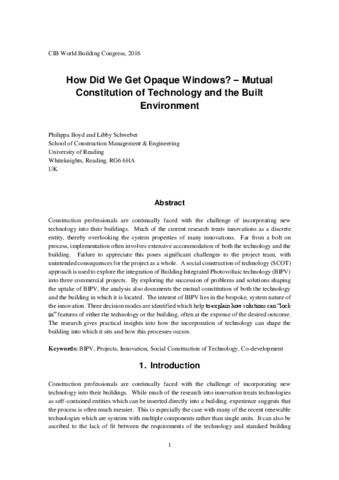 Construction professionals are continually faced with the challenge of incorporating new technology into their buildings. Much of the current research treats innovations as a discrete entity, thereby overlooking the system properties of many innovations. Far from a bolt on process, implementation often involves extensive accommodation of both the technology and the building. Failure to appreciate this poses significant challenges to the project team, with unintended consequences for the project as a whole. A social construction of technology (SCOT) approach is used to explore the integration of Building Integrated Photovoltaic technology (BIPV) into three commercial projects. By exploring the succession of problems and solutions shaping the uptake of BIPV, the analysis also documents the mutual constitution of both the technology and the building in which it is located. The interest of BIPV lies in the bespoke, system nature of the innovation. Three decision modes are identified which help to explain how solutions can “lock in” features of either the technology or the building, often at the expense of the desired outcome. The research gives practical insights into how the incorporation of technology can shape the building into which it sits and how this processes occurs.